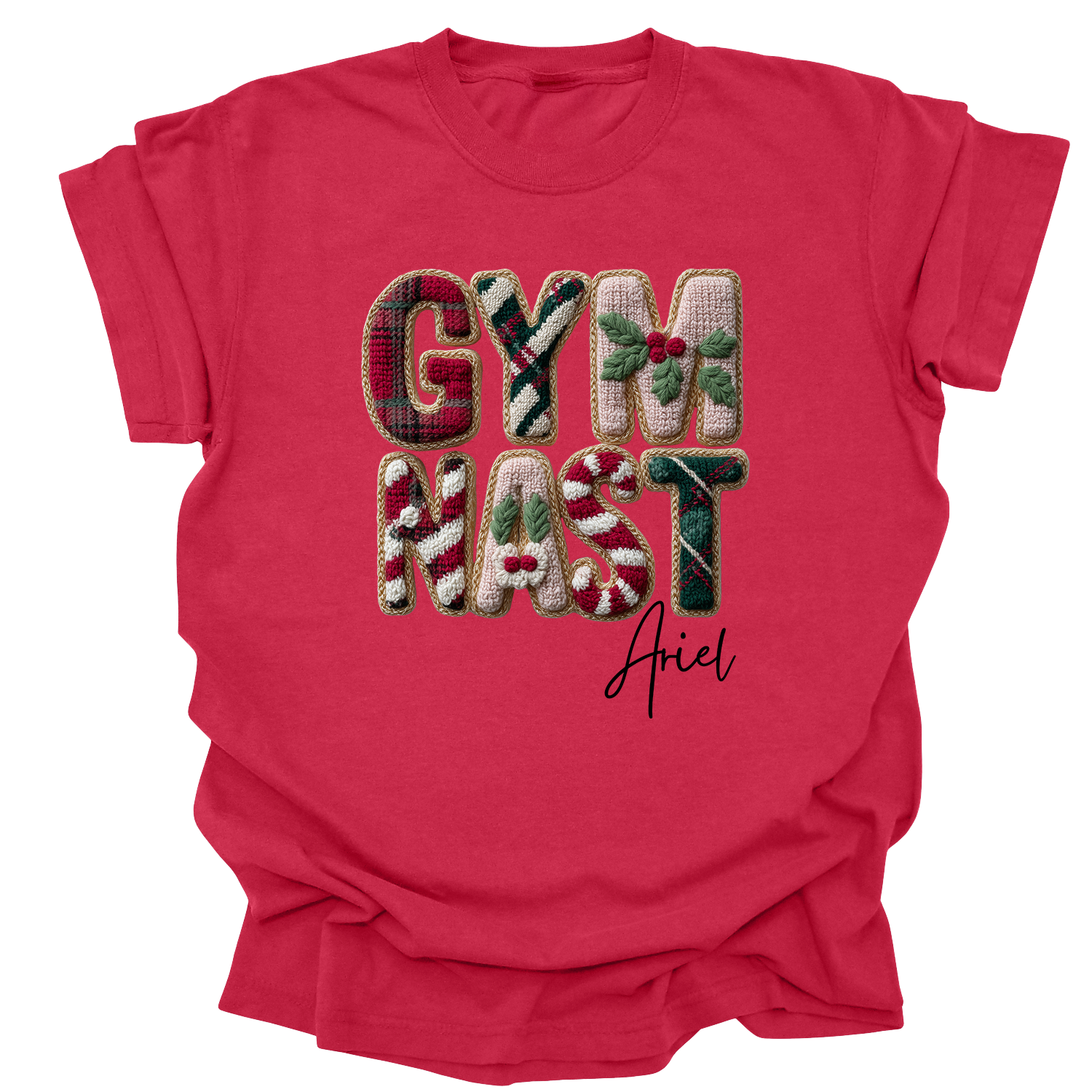Personalized Gymnast Christmas Tee | Custom Name Holiday Shirt | Crochet Look Festive Gymnast T-Shirt