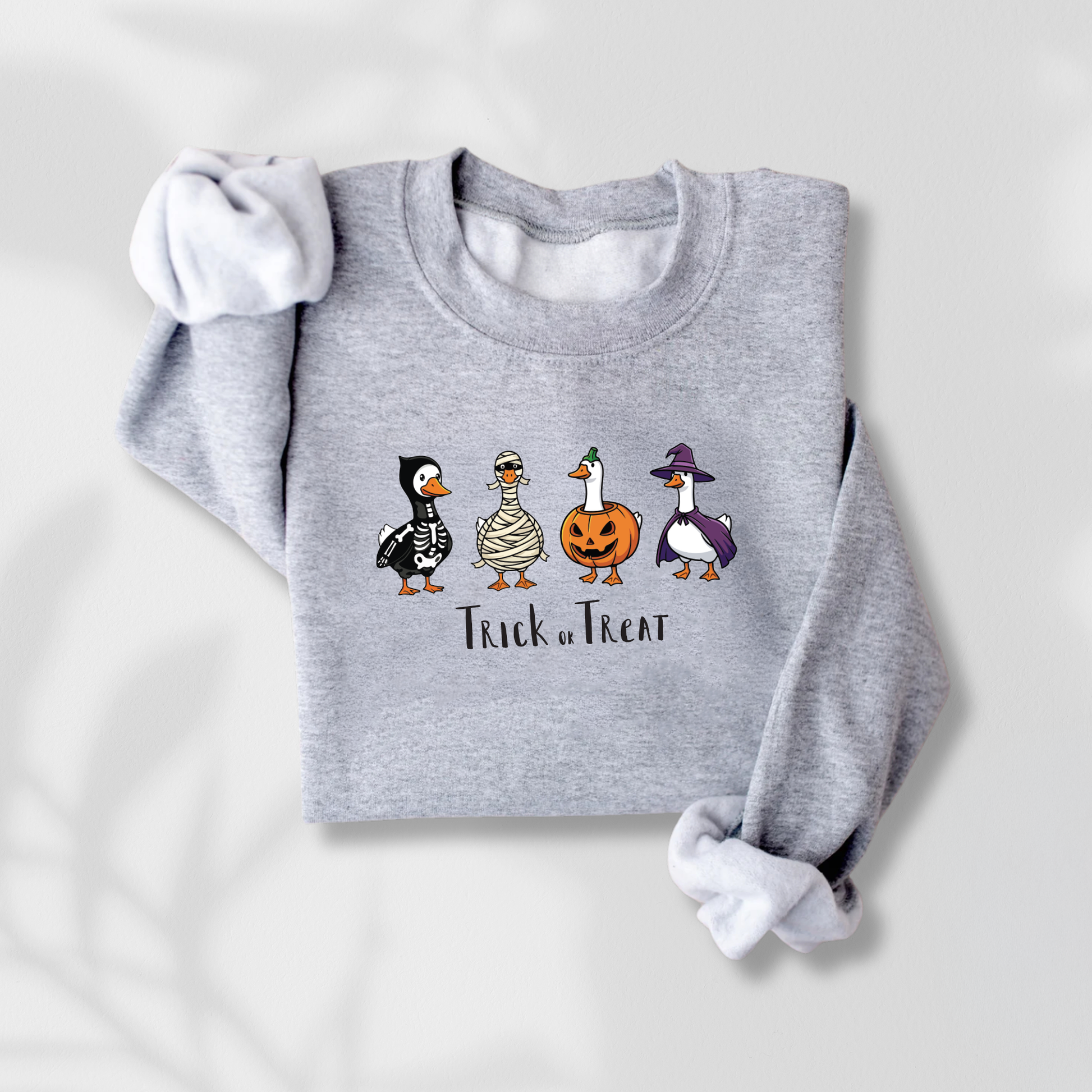Get ready for spooky season in style with our Trick or Treat Goose Halloween Sweatshirt! 🎃🦆 Perfect for kids, teens, and adults, this cozy sweatshirt features four adorable geese dressed up in classic Halloween costumes – skeleton, mummy, pumpkin, and witch. A fun and festive way to celebrate fall, trick-or-treating, or Halloween parties!