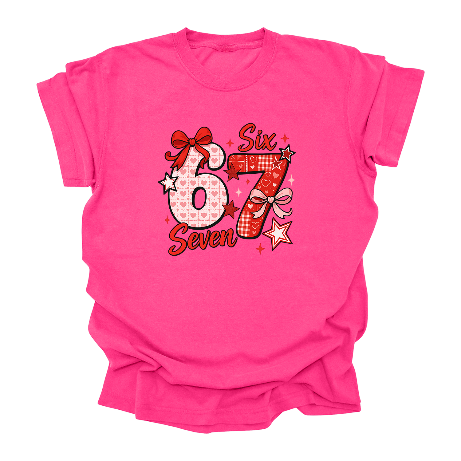 Join the viral TikTok trend with the Six O Seven Valentine's Day T-Shirt! If you know, you know—this adorable design celebrates the trending 6-7 phenomenon that's taken social media by storm. Featuring playful hand-drawn hearts, bows, gingham patterns, and stars in sweet Valentine shades of pink and red, this shirt is perfect for anyone riding the viral wave.
